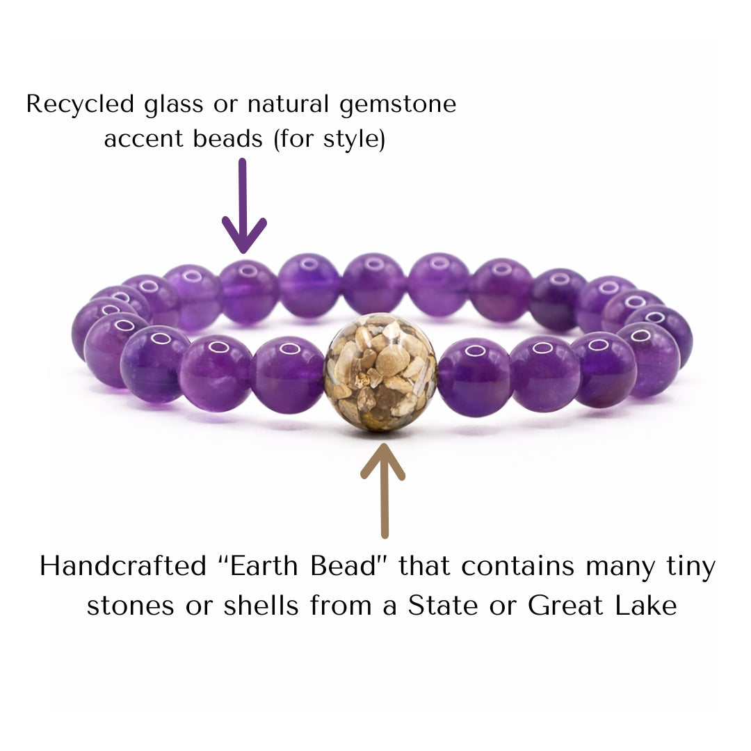 Each bracelet features an "Earth Bead" made with stones sourced from these beloved States & Great Lakes, creating a tangible connection to their unique beauty and the memories made.