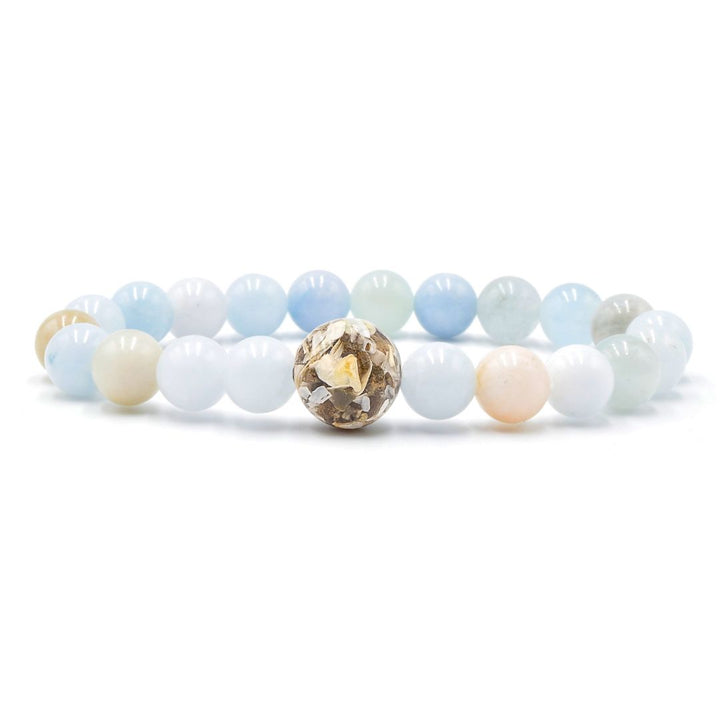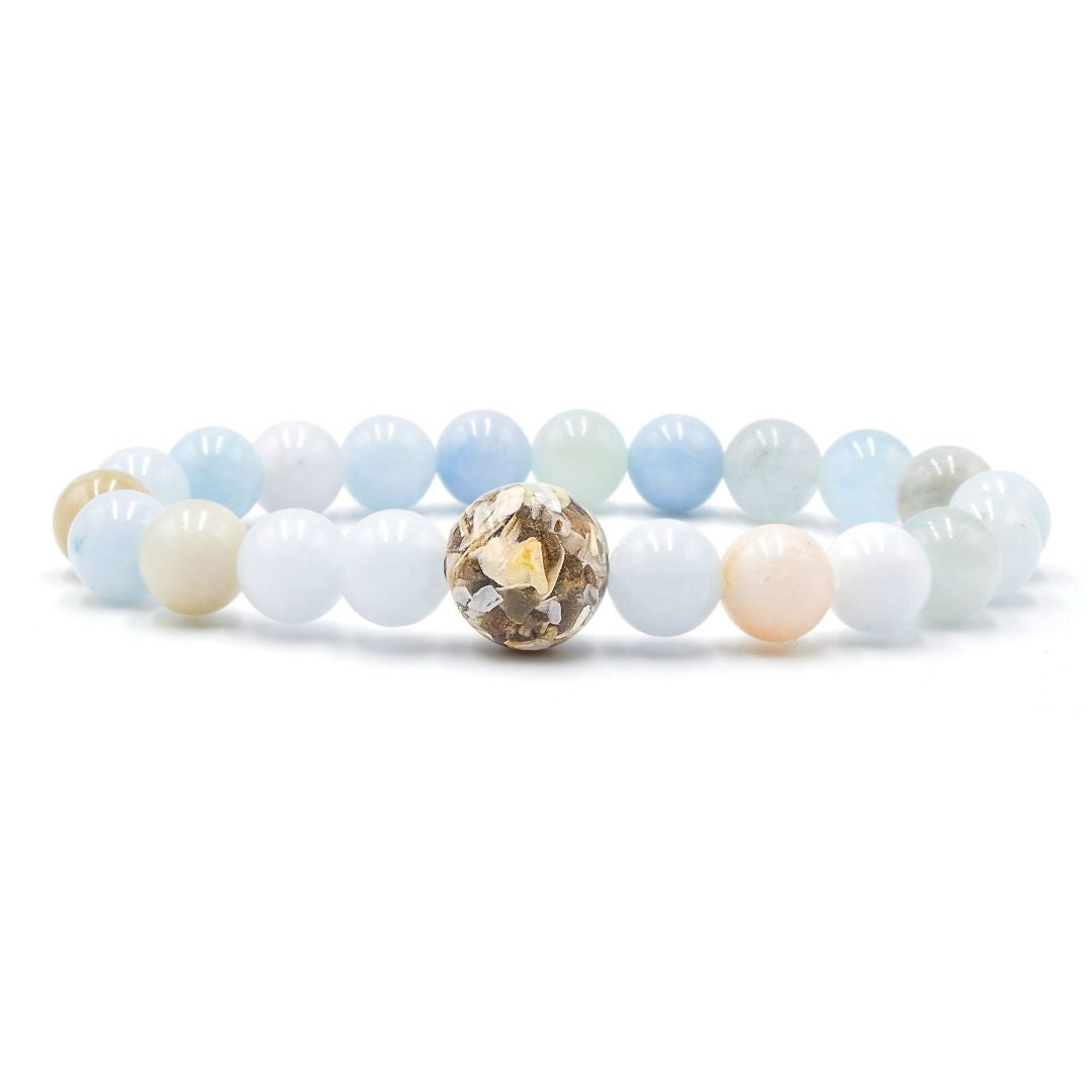 The larger “Earth Bead” of this bracelet contains stones and shells collected by hand from the shorelines of Lake Erie. Each Earth Bead is hand-crafted in our small shop in Michigan, a process which takes 50+ hours per bead. Each Earth Bead is literally one-of-a-kind.