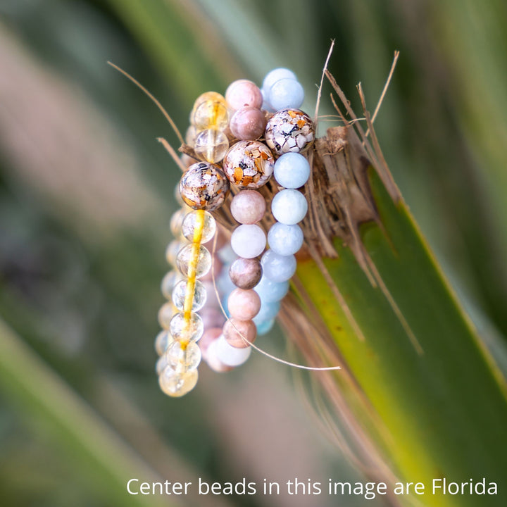 The larger “Earth Bead” of this bracelet contains stones collected by hand from the shorelines of Lake Huron. Each Earth Bead is hand-crafted in our small shop in Michigan, a process which takes 50+ hours per bead. Each Earth Bead is literally one-of-a-kind.