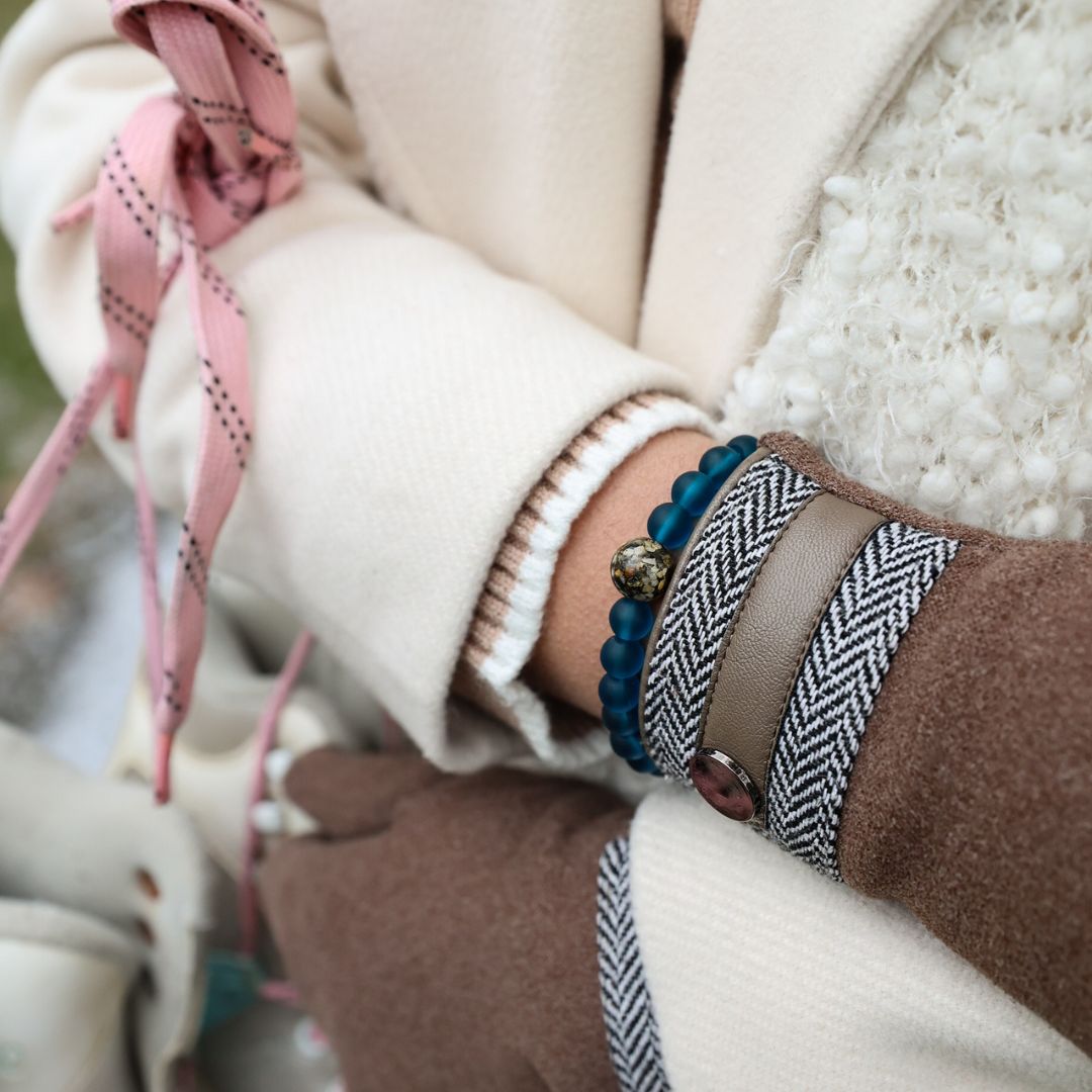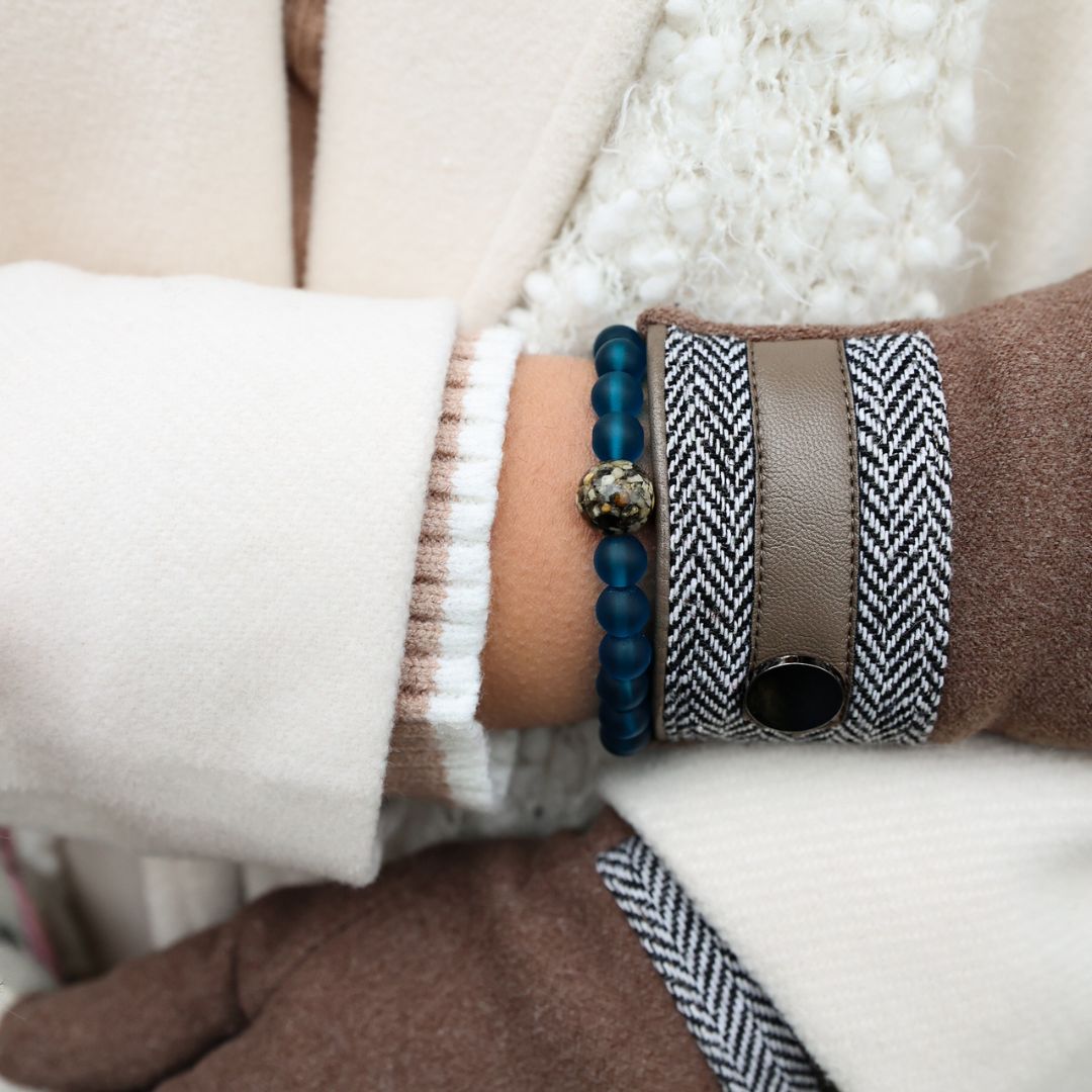 - Surrounding beads (8mm) made of 100% recycled glass