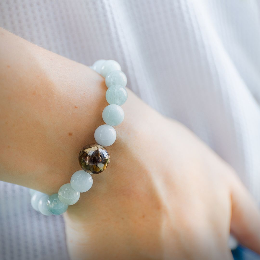 The larger “Earth Bead” of this bracelet contains Leland Blue stones. Each Earth Bead is hand-crafted in our small shop in Michigan, a process which takes 50+ hours per bead. Each Earth Bead is literally one-of-a-kind.