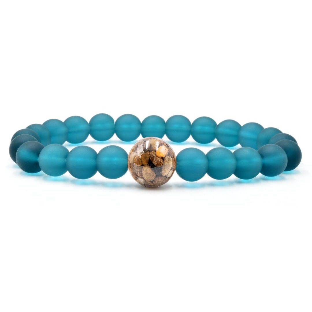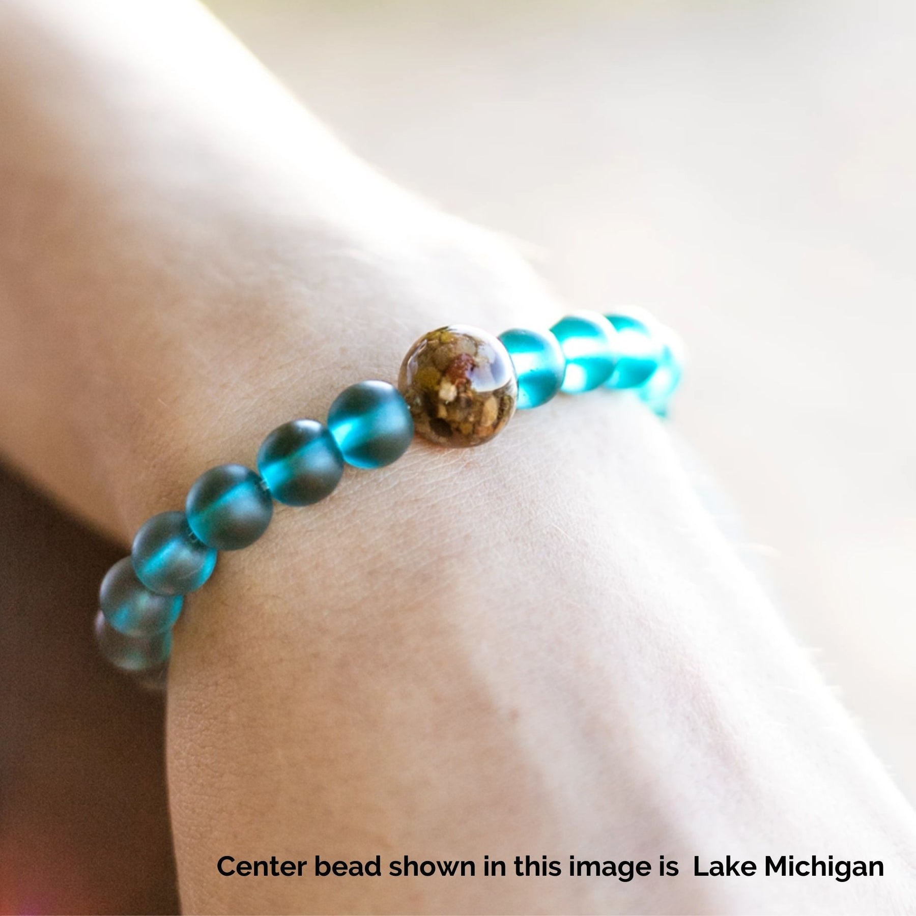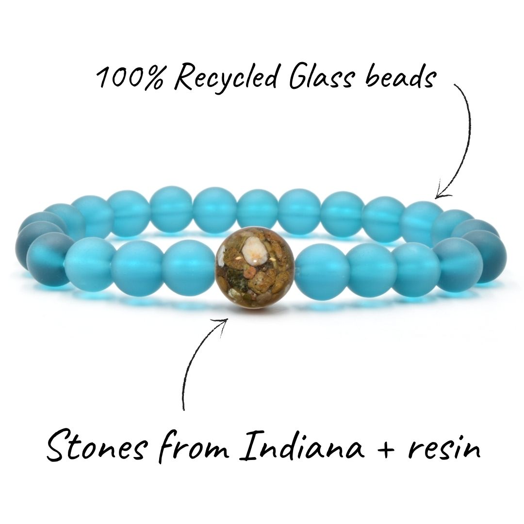 The larger “Earth Bead” of this bracelet contains stones collected by hand from throughout the state of Indiana. Each Earth Bead is hand-crafted in our small shop in Michigan, a process which takes 50+ hours per bead. Each Earth Bead is literally one-of-a-kind.