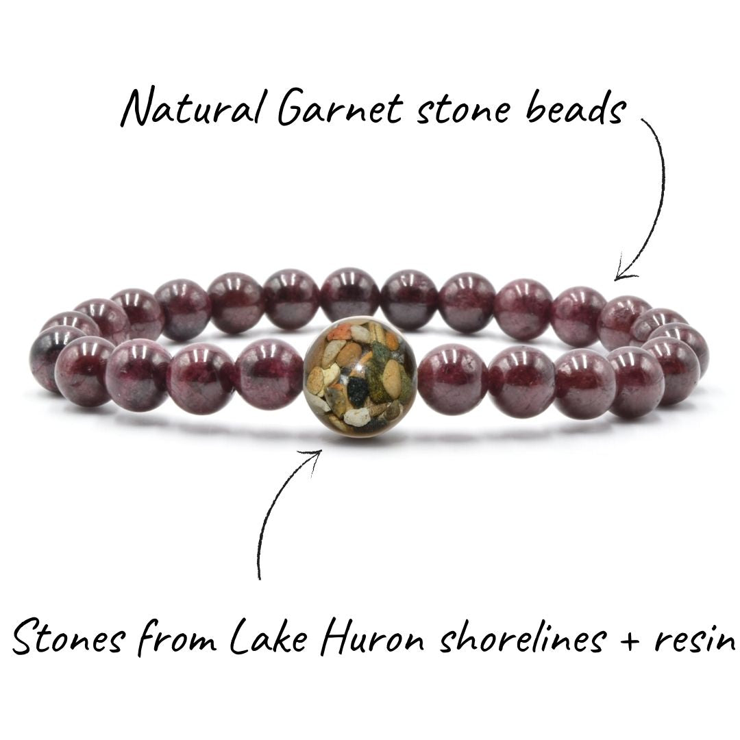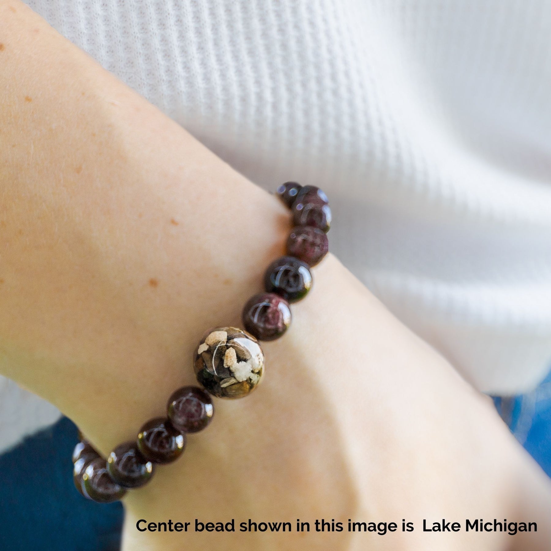 The larger “Earth Bead” of this bracelet contains stones collected by hand from the shorelines of Lake Huron. Each Earth Bead is hand-crafted in our small shop in Michigan, a process which takes 50+ hours per bead. Each Earth Bead is literally one-of-a-kind.