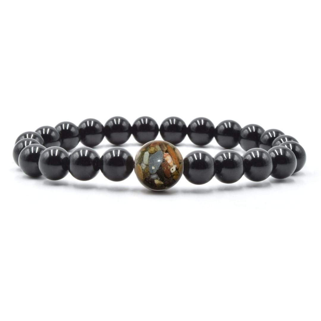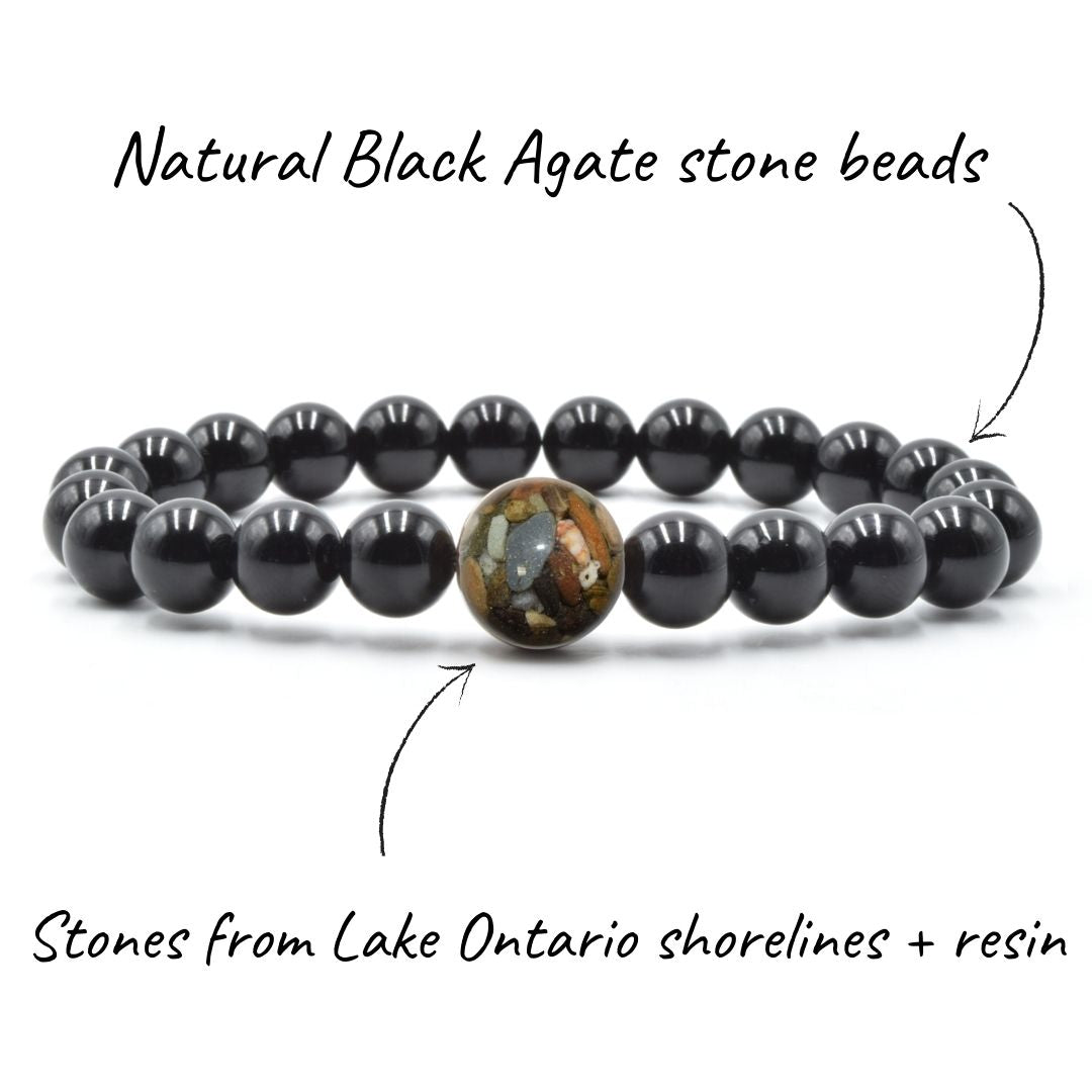 The larger “Earth Bead” of this bracelet contains stones collected by hand from the shorelines of Lake Ontario. Each Earth Bead is hand-crafted in our small shop in Michigan, a process which takes 50+ hours per bead. Each Earth Bead is literally one-of-a-kind.