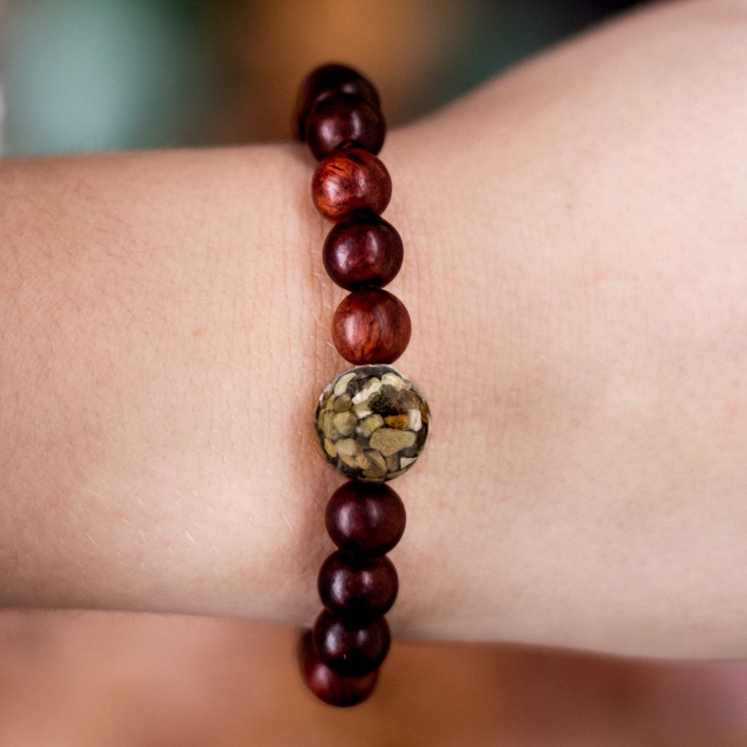 Every Homes Bracelet features an "Earth Bead," made by molding earth materials like stones, sand, shells, or ocean salt, with high quality resin. Each bead is then individually sanded and polished and prepped to be strung onto the bracelet.