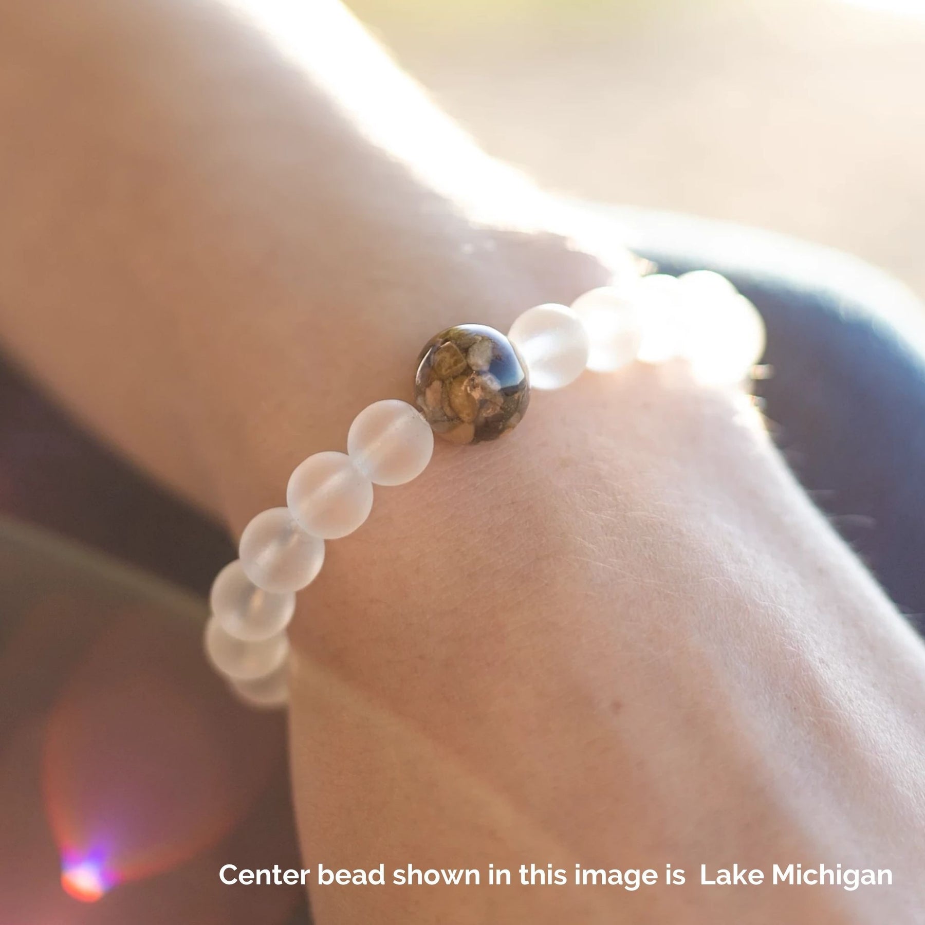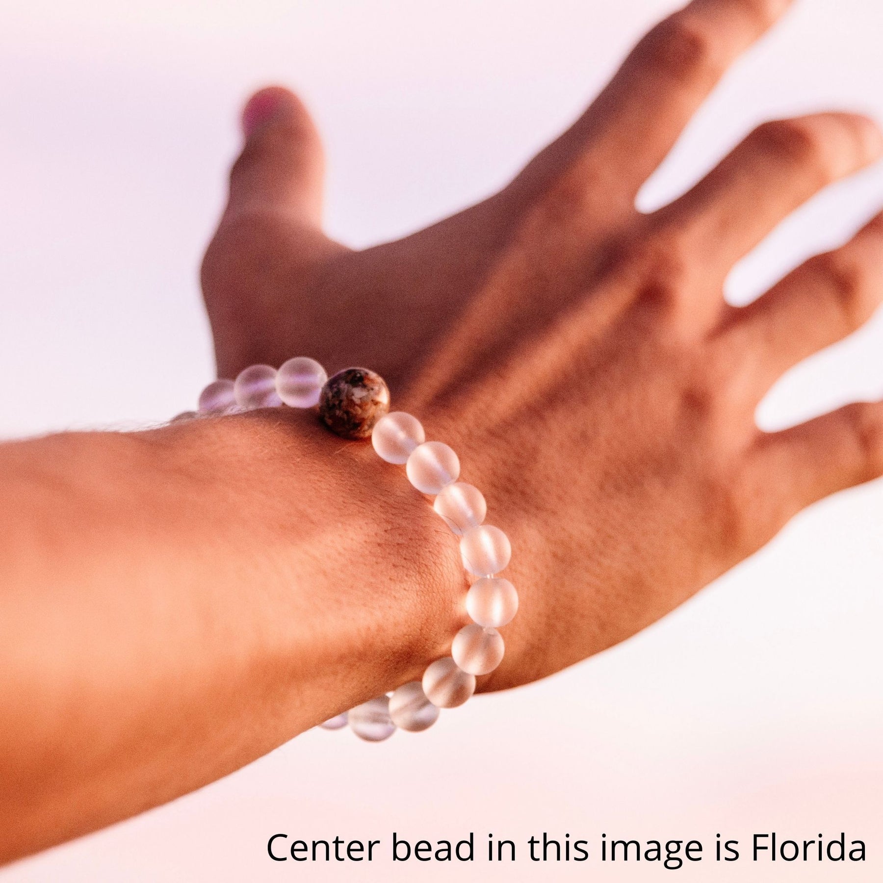 The larger “Earth Bead” of this bracelet contains stones collected by hand from throughout the state of Nevada. Each Earth Bead is hand-crafted in our small shop in Michigan, a process which takes 50+ hours per bead. Each Earth Bead is literally one-of-a-kind.