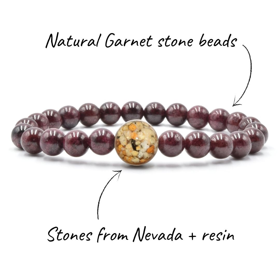 The larger “Earth Bead” of this bracelet contains stones collected by hand from throughout the state of Nevada. Each Earth Bead is hand-crafted in our small shop in Michigan, a process which takes 50+ hours per bead. Each Earth Bead is literally one-of-a-kind.