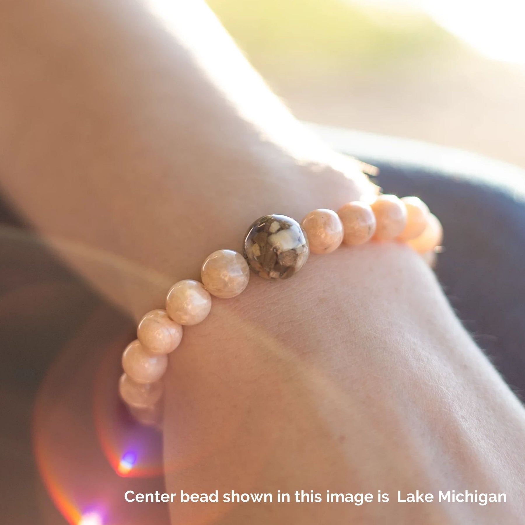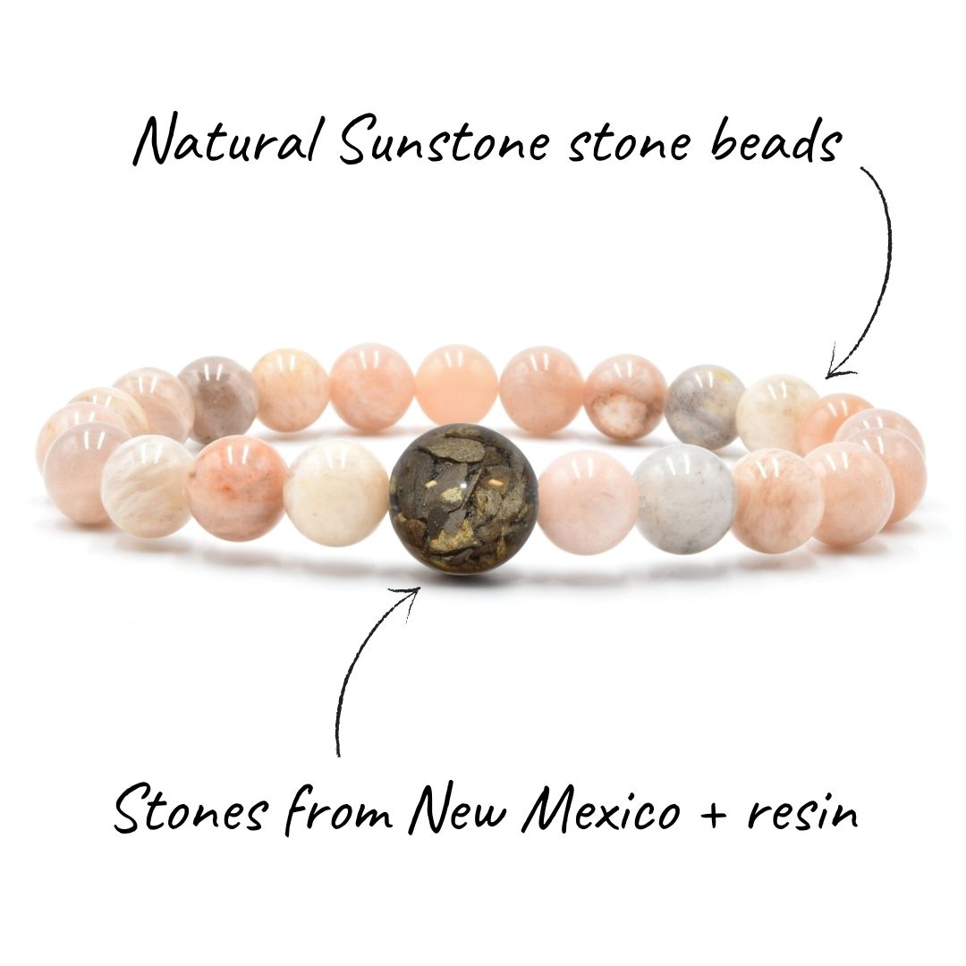 The larger “Earth Bead” of this bracelet contains stones collected by hand from throughout the state of New Mexico. Each Earth Bead is hand-crafted in our small shop in Michigan, a process which takes 50+ hours per bead. Each Earth Bead is literally one-of-a-kind.